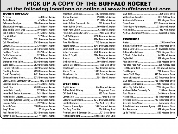 David H. Gallagher - Publisher Dennis Gallagher - Managing Editor Daryl Gallagher - Production Director Bill Snyder - Writer Megan DeNardin - Graphic Artist John Raymond - Graphic Artist Email Camera Ready Ads to: editor.buffalorocket@gmail.com Submit Press Releases to: editor.buffalorocket@gmail.com Established in 1969